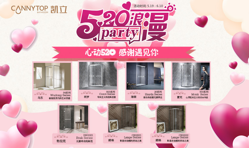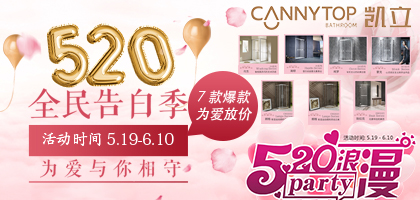 5月是一個充滿溫馨與愛情的月份,不但有感恩母愛的母親節,還有戀人間互表心跡的“5?20表白日”?!??20”是一個人們表達濃濃愛意的日子,除了送傳統的玫瑰花、首飾等等禮物,何不為他/她共筑一個溫馨的住所呢?因此,為迎本次“5?20表白節”,作為淋浴房十大品牌——凱立淋浴房在2018年5月19日—6月10日推出主題為“520浪漫party”的全國性回饋消費者的活動,打造有溫度的5?20表白節,用愛回饋消費者一直以來對凱立的信任和支持。