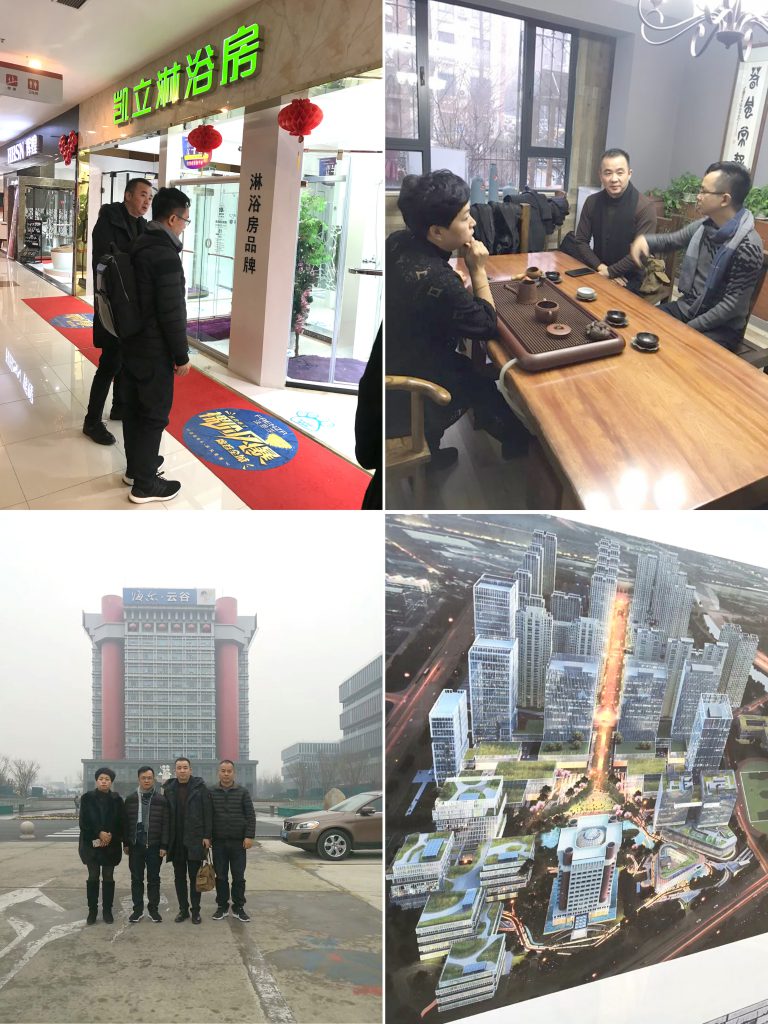 2019年1月10至2019年1月11日,中山凱立潔具有限公司董事總經理徐振幼先生、副總經理、董事長助理肖建華先生、國內渠道系統主要負責人蕭鴻琪先生、工程系統主要負責人屈光瑞先生到訪青島海爾集團,參觀山東青島海爾集團,海爾地產總部,在青島經銷商郭總的全程陪同下走訪青島居然之家青島市北店凱立淋浴房專賣店、青島海博家居重慶路店凱立淋浴房專賣店。