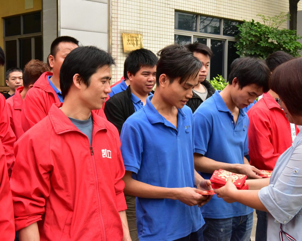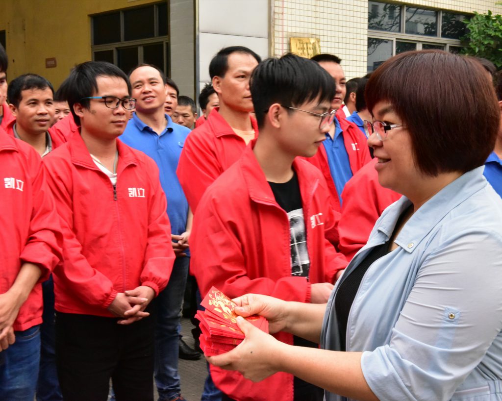 董事長徐少果女士、董事總經理徐振幼先生、公司副總經理肖建華先生向凱立家人拜年,派紅包,鼓干勁。