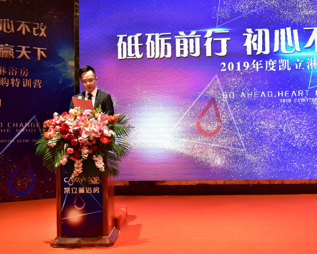 本次2019年度凱立淋浴房全國第一期精英導(dǎo)購特訓(xùn)營(yíng)開學(xué)典禮暨凱立淋浴房(中國)商學(xué)院揭牌儀式由凱立淋浴房國內(nèi)渠道部主要負(fù)責(zé)人劉大衛(wèi)先生主持。
