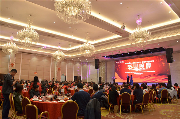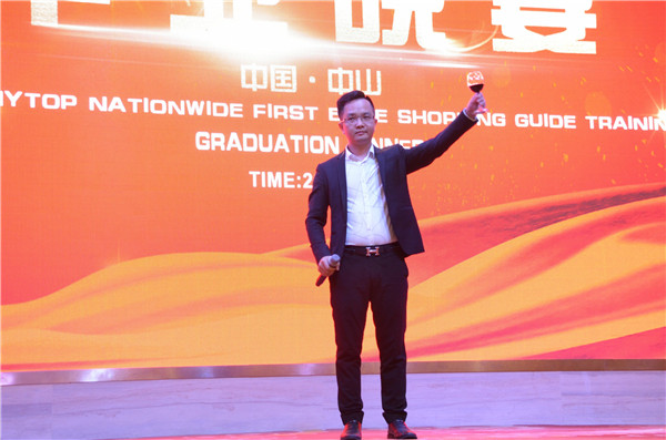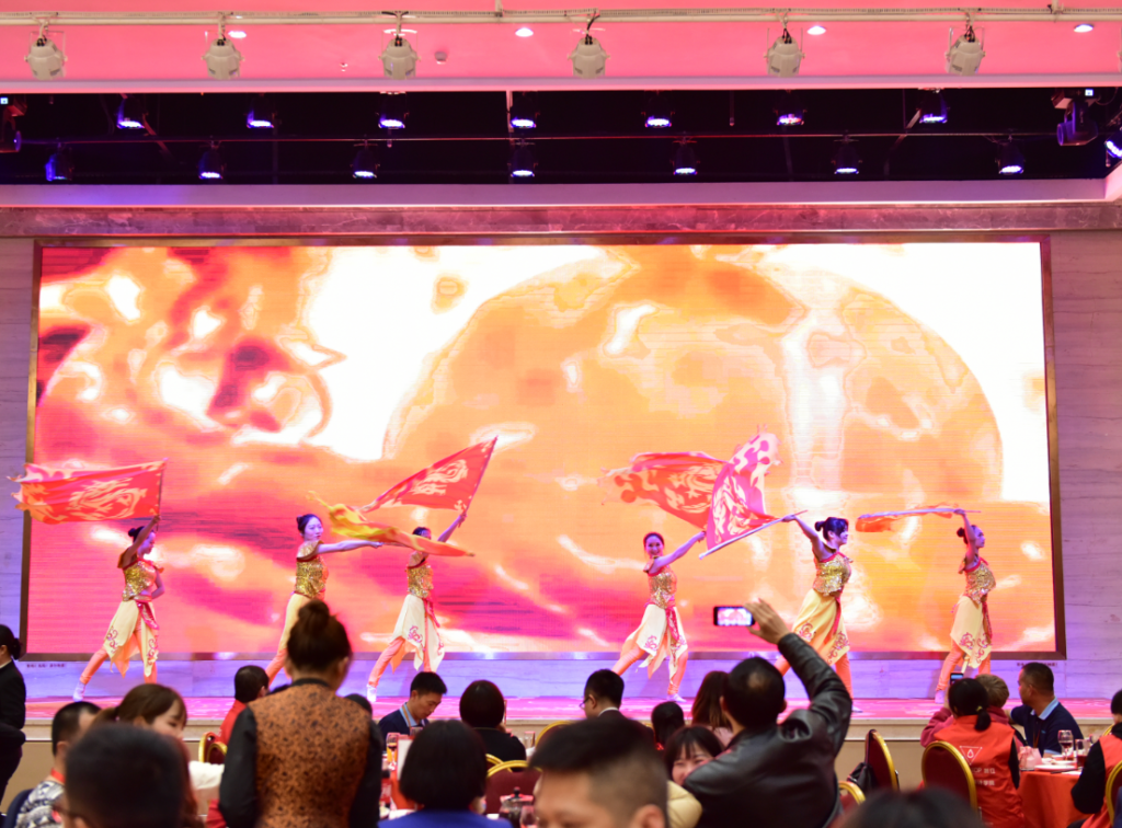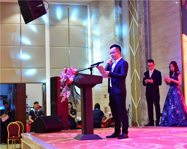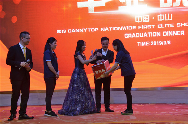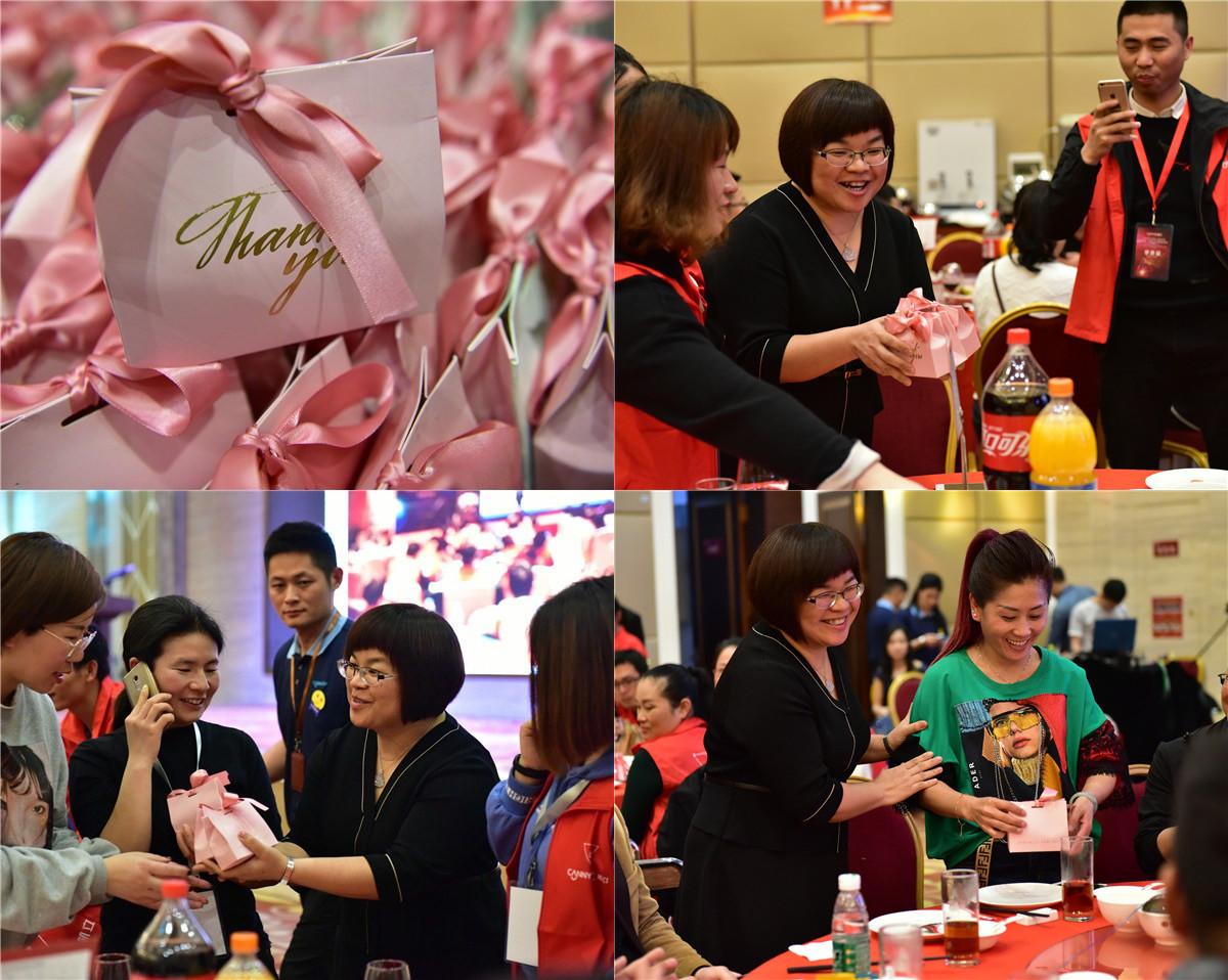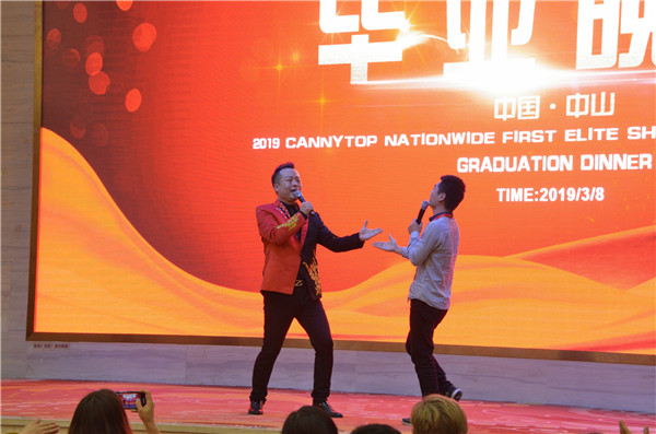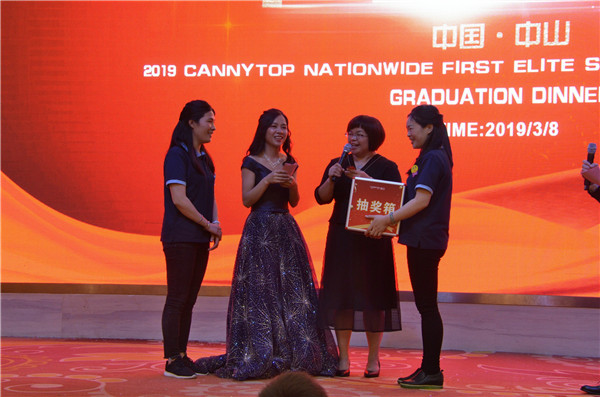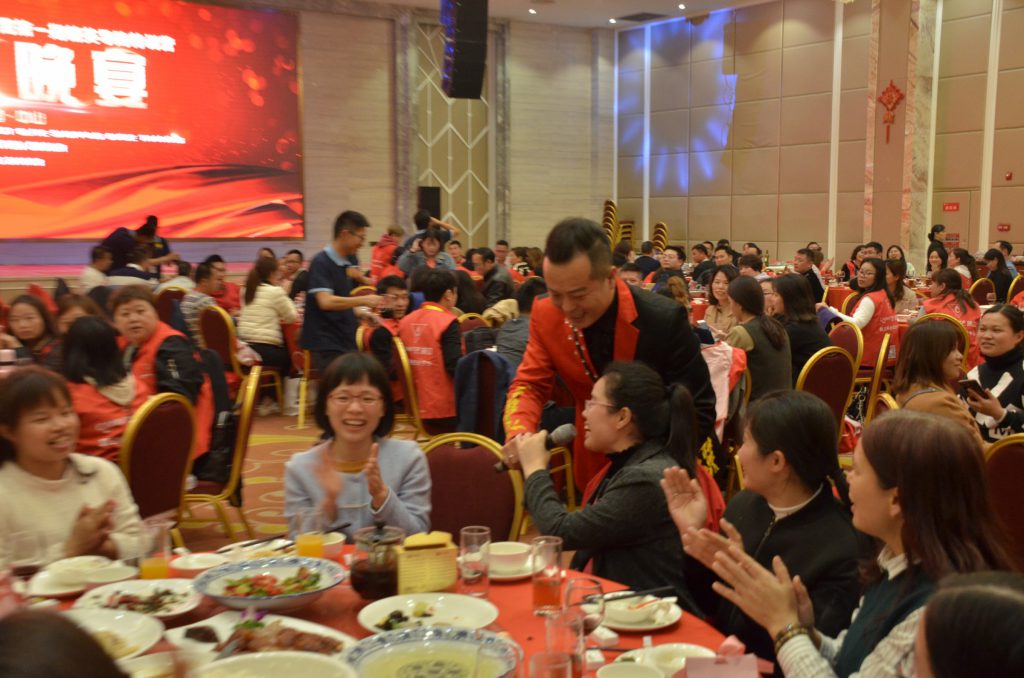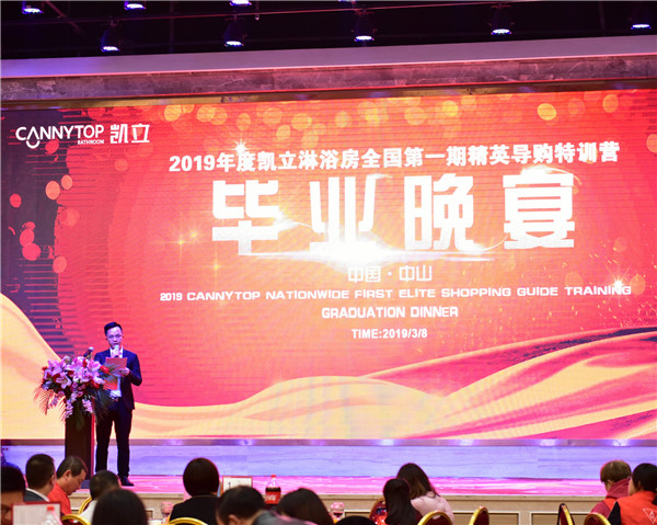 結束了一天的活動,下午18:30全體學員進入了信軒酒店的宴會大廳,進入大廳后,寬敞的舞臺背景顯示著“2019年度凱立淋浴房全國第一期精英導購特訓營畢業晚宴”;全體人員入座后,晚宴正式開始,時逢“三八婦女節”,今天的晚宴除了全體學員外,還邀請了凱立工廠的全體管理干部和女同事,凱立公司為每一位女同事和女學員精心準備了一份節日禮品,并第一時間派發給大家,祝賀大家節日快樂。