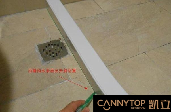 接下來就是安裝了:第一先把擋水條放在要安裝的位置,然后畫線,留好安裝位置。記住別把外面的地漏畫進去了。