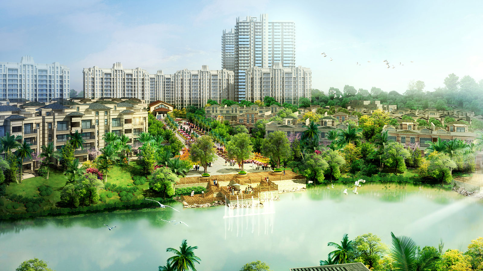 鳳凰水城南岸小區位于金雞嶺路和解放路交匯處,面朝三亞河,與鳳凰灣隔河相望,打開窗戶就能看到三亞河。小區各個區域被人工河分割成獨立的私人空間,河道上鋪設復古式的木質小橋,行走在木橋上,兩旁或是淡黃色英倫風格的房屋,或是郁郁蔥蔥的樹木草地,真有移步換景之感。