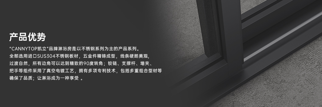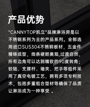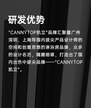 享譽(yù)全球的中國十大淋浴房品牌——凱立淋浴房cannytop,是一家集設(shè)計(jì)、研發(fā)、生產(chǎn)、銷售高品質(zhì)淋浴房及配套產(chǎn)品為一體的現(xiàn)代化大型生產(chǎn)企業(yè); 旗下?lián)碛邢冗M(jìn)的現(xiàn)代化生產(chǎn)品設(shè)備和玻璃、五金深加工生產(chǎn)線,擁有18000平米的工業(yè)園廠房生產(chǎn)基地;產(chǎn)品嚴(yán)格執(zhí)行ISO9001-2000國際質(zhì)量體系認(rèn)證,強(qiáng)大的設(shè)計(jì)創(chuàng)作團(tuán)隊(duì),同時與國內(nèi)外相關(guān)科研機(jī)構(gòu)展開廣泛合作,在產(chǎn)品外觀、結(jié)構(gòu)等多個領(lǐng)域?qū)崿F(xiàn)創(chuàng)新突破,已取得產(chǎn)品超過20項(xiàng)淋浴房生產(chǎn)專利,將淋浴房行業(yè)指引到一個全新的高度。